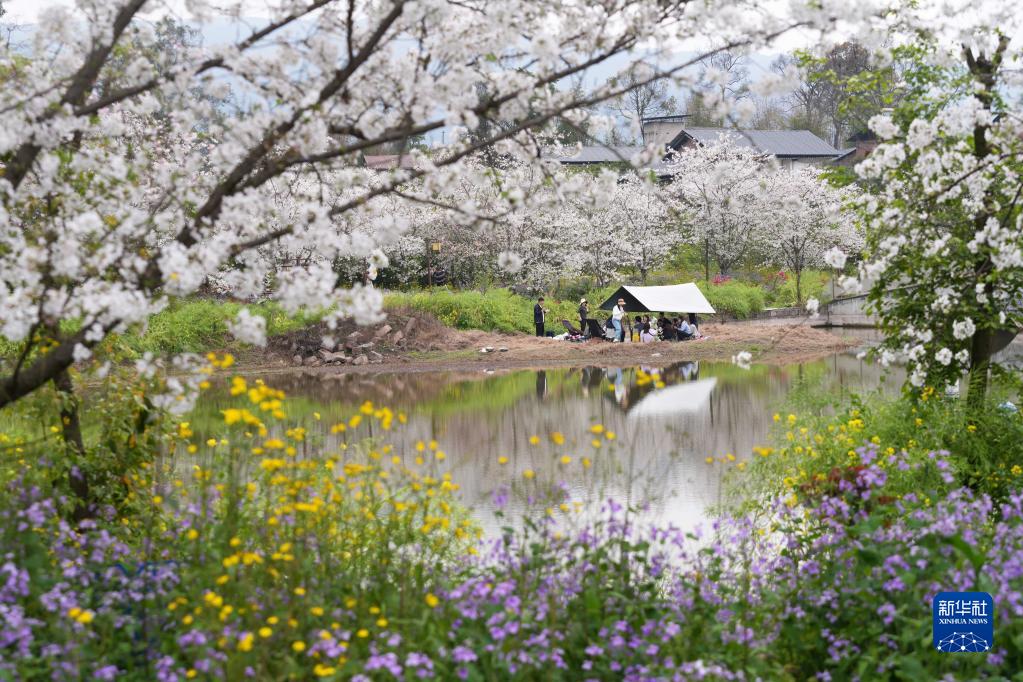 3月19日,游人在重庆市北碚区澄江镇五一村“樱花橘香”农业公园的樱花树下露营游玩。