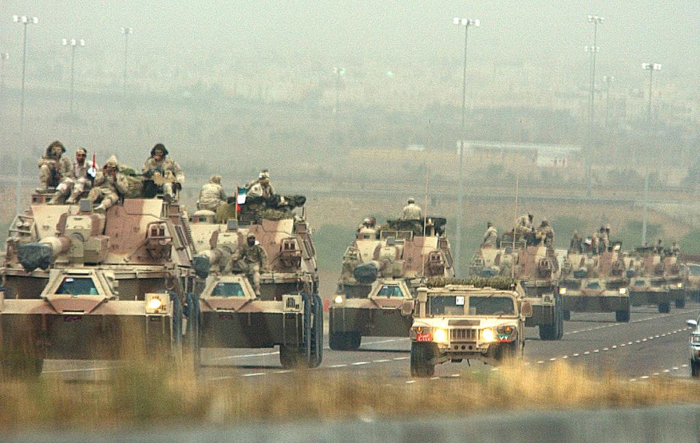 2003年3月25日,美军几十辆装甲车辆从科威特城驶向科威特与伊拉克边境。新华社记者 李晓果 摄