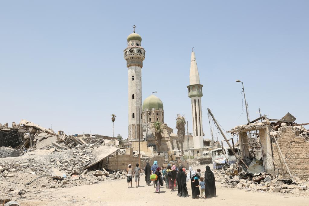 2017年7月10日,伊拉克时任总理阿巴迪宣布极端组织“伊斯兰国”在北部重镇摩苏尔的统治已被彻底推翻,这个城市于当天全面解放。经过“伊斯兰国”三年统治和大半年的攻城之战,摩苏尔解放时已破败不堪。图为宣布解放当天,当地平民从摩苏尔老城的建筑废墟旁走过。新华社发(哈利勒·达伍德摄)