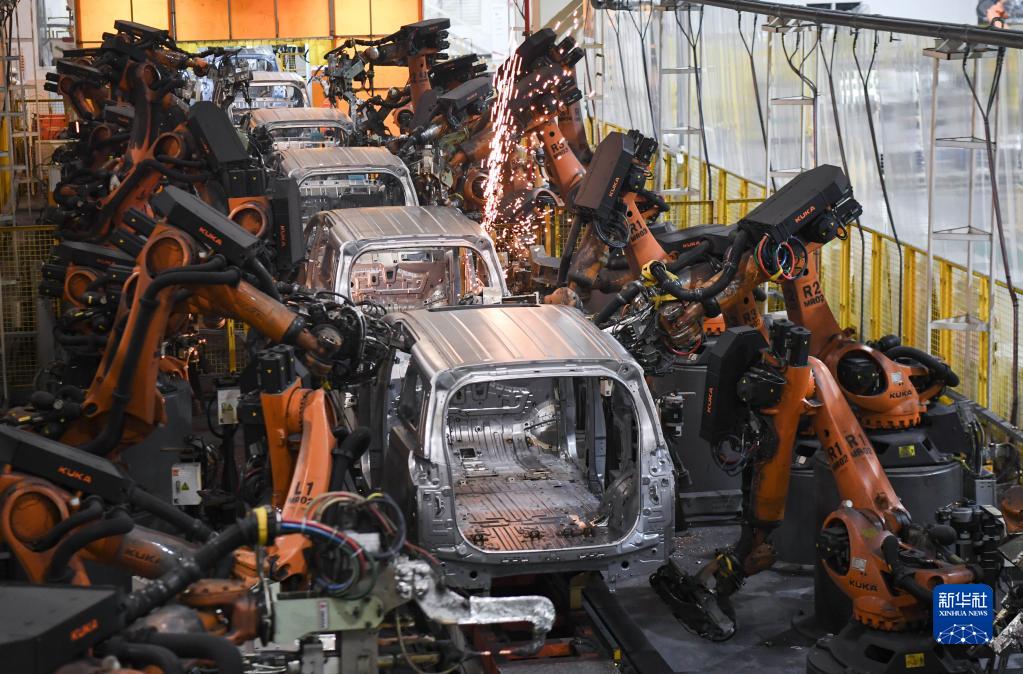 在广州的广汽传祺焊装工厂车身总成线,机器人手臂在进行焊接作业(3月20日摄)。