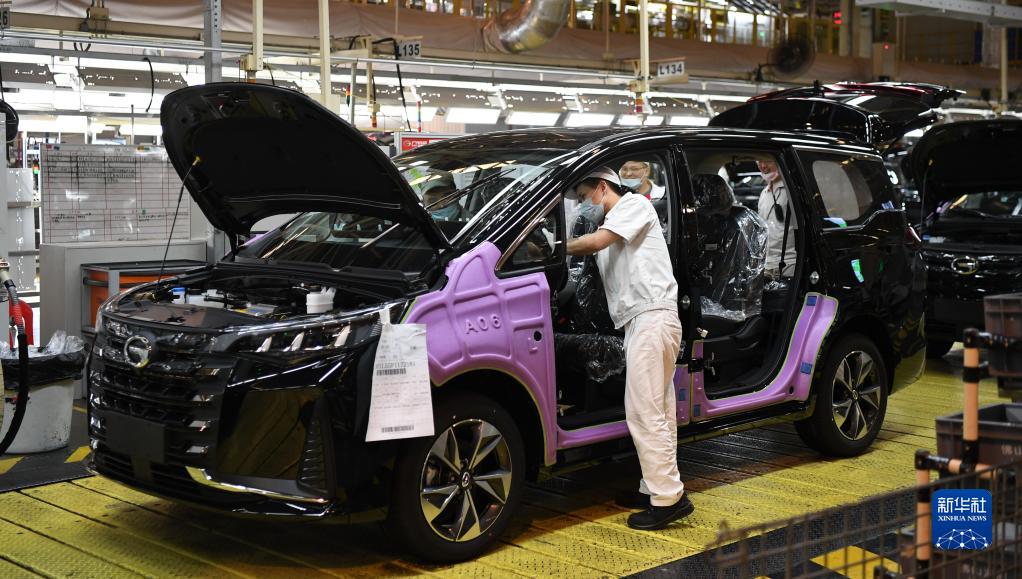 工人在广州的广汽传祺智慧工厂总装车间生产线上工作(3月20日摄)。