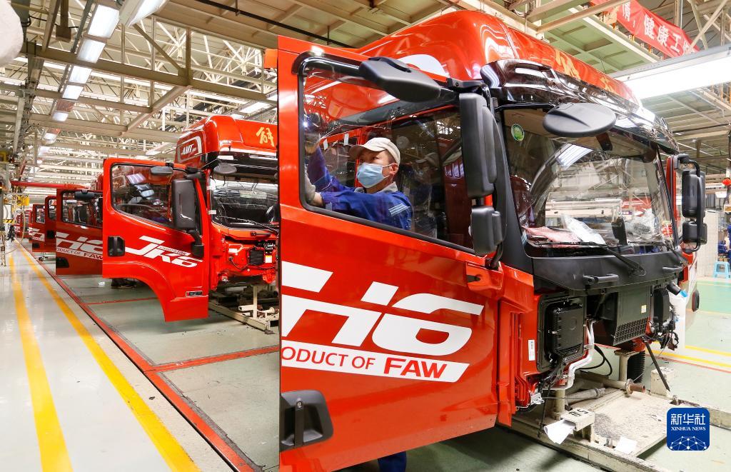 3月20日,在位于山东省青岛市即墨区的一汽解放青岛汽车有限公司总装车间,工人在组装汽车。