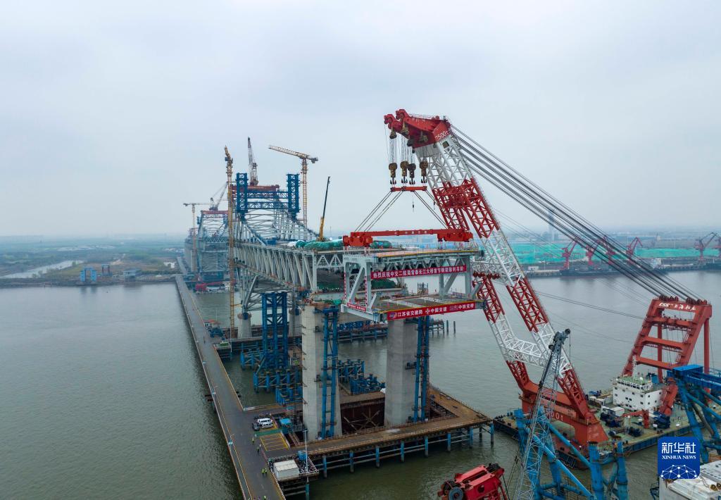 3月20日,中交二航局建设者在常泰长江大桥主航道桥泰州侧施工现场进行首节段钢桁梁架设(无人机照片)。