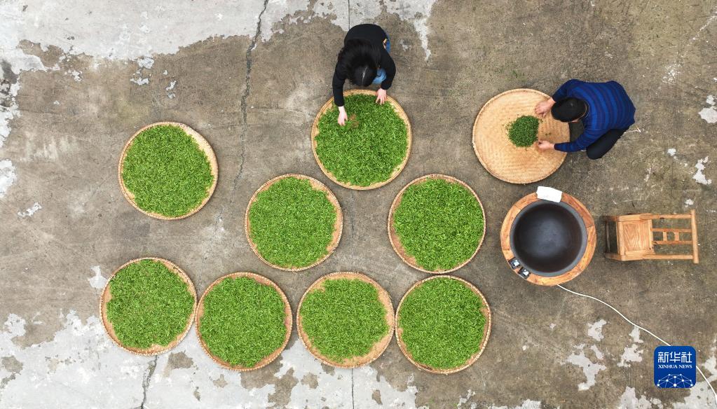 3月20日,在湖南衡阳常宁市塔山瑶族乡,茶农在炒茶(无人机照片)。