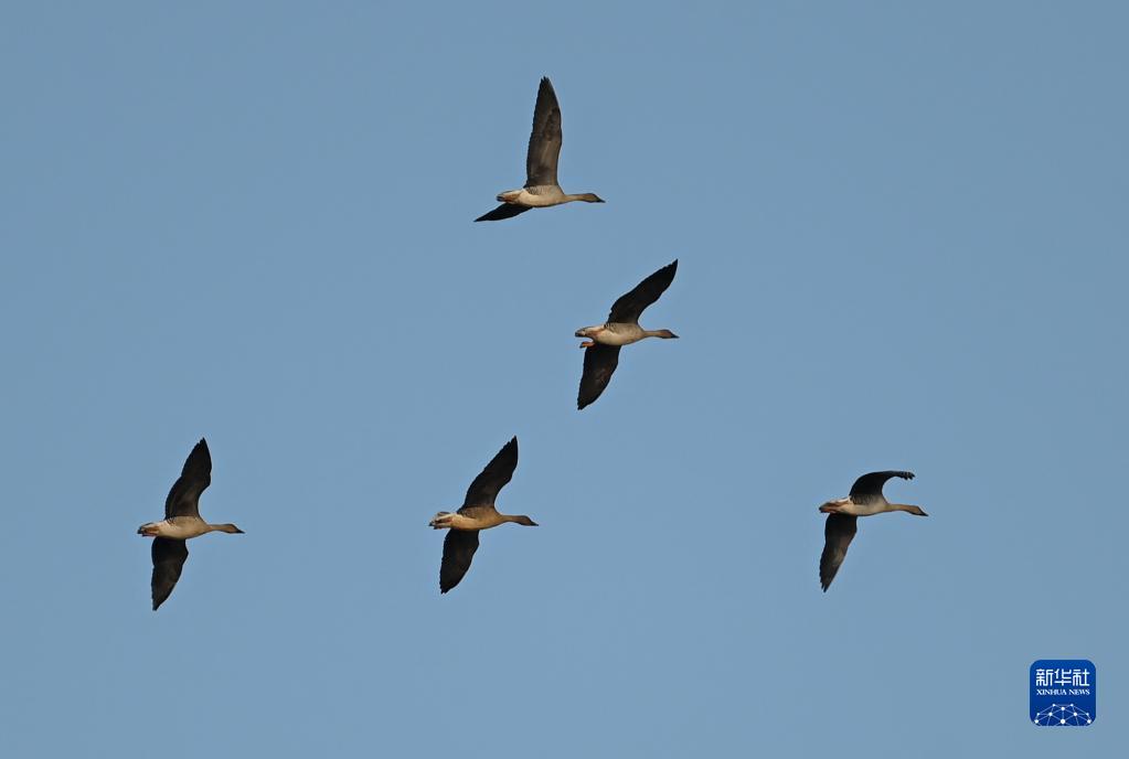 3月20日,在内蒙古自治区呼和浩特市托克托县黄河沿岸,大雁在空中飞翔。