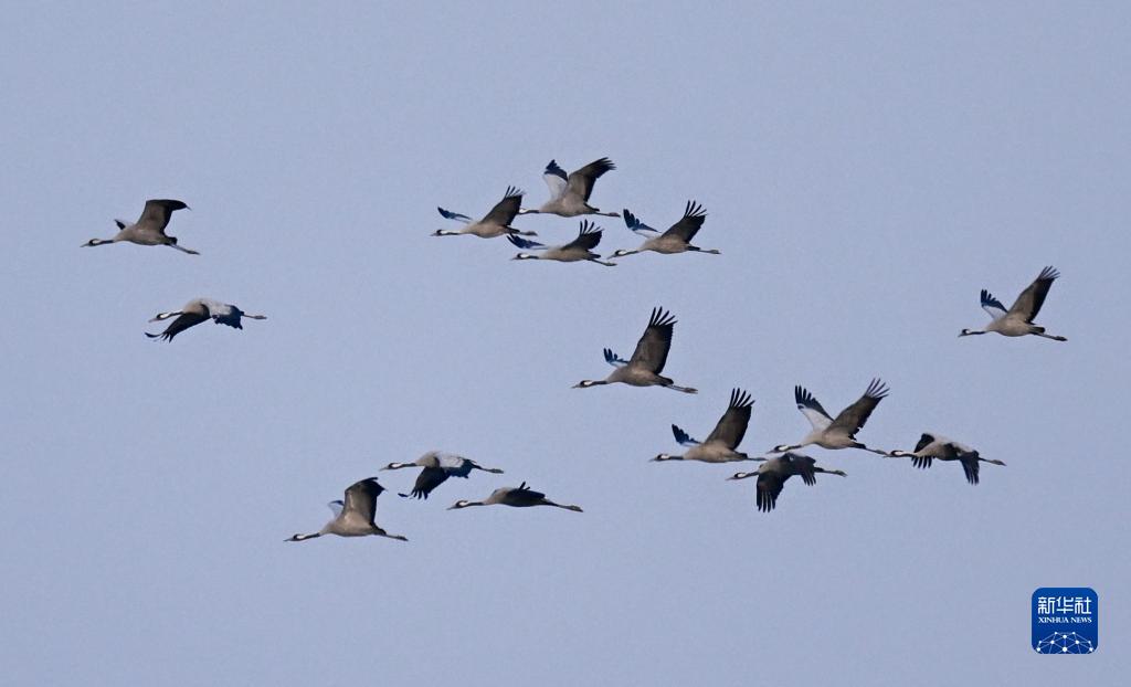 3月20日,在内蒙古自治区呼和浩特市托克托县黄河沿岸,黑颈鹤在空中飞翔。