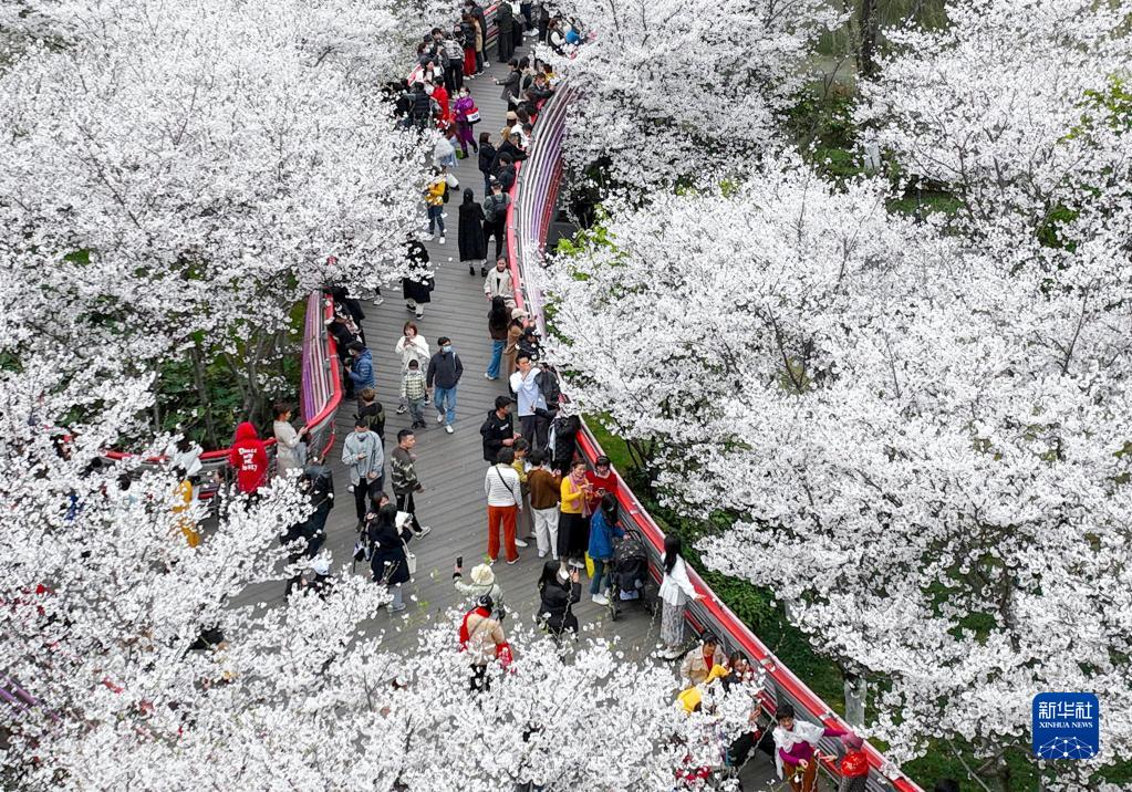 3月20日,游客在浙江省宁波市鄞州区樱花公园游玩赏花(无人机照片)。
