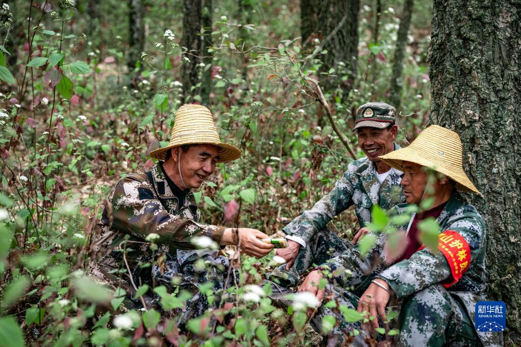 护林员陈华(左)在巡山途中休息(3月20日摄)。