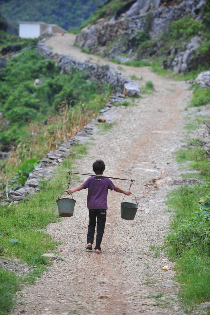 在广西大化瑶族自治县板升乡弄勇村,村民去山上挑水(2012年7月16日摄)。
