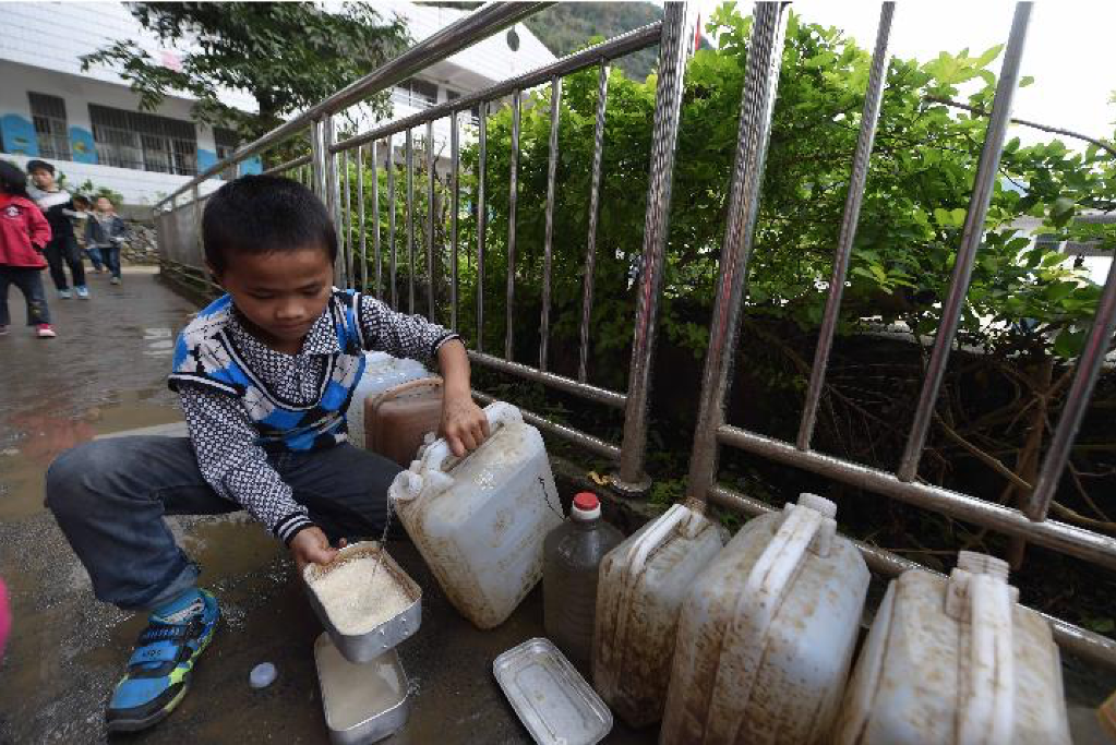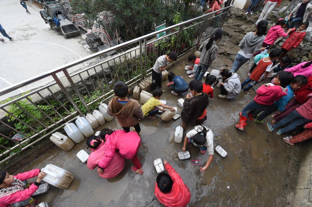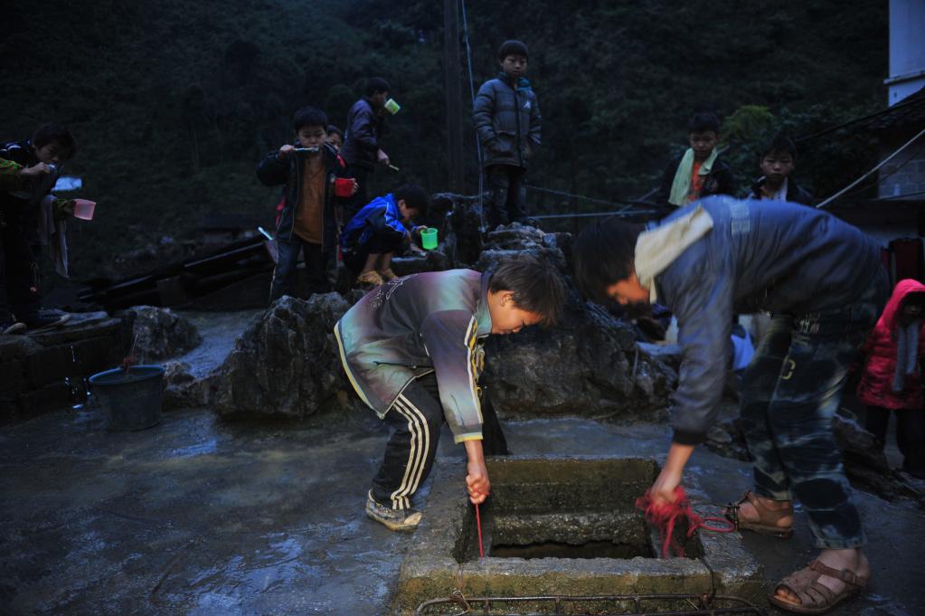 2014年11月24日,八好小学学生用储备在水桶里的雨水淘米煮饭。