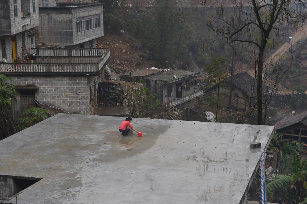 在弄勇村弄朝屯,一阵大雨过后,村民在收集房顶上的积水(2015年2月12日摄)。