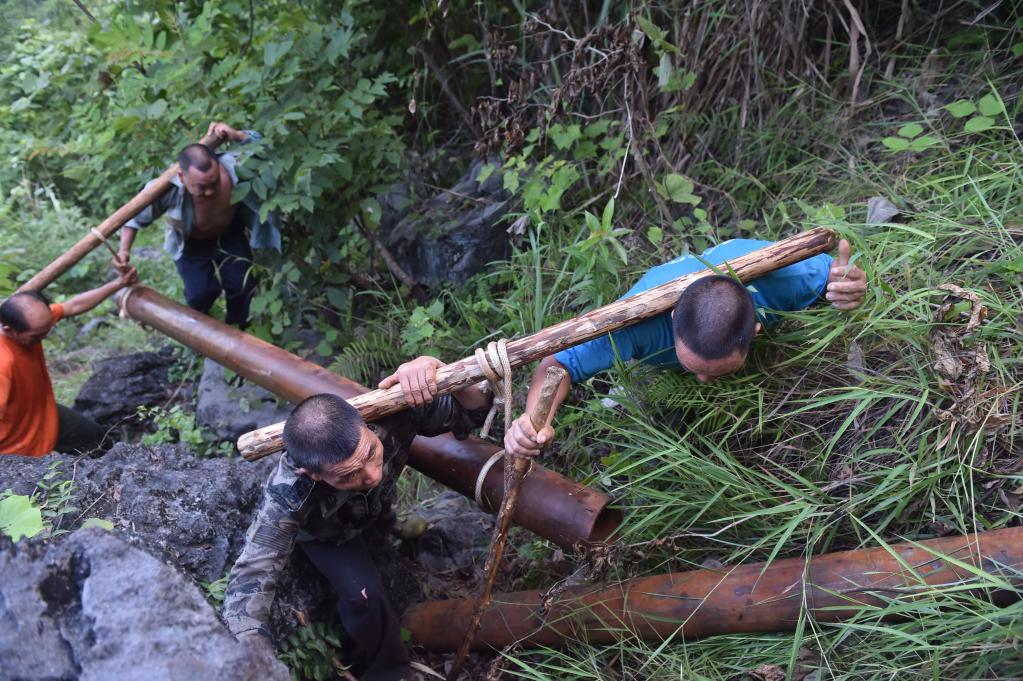 正是在这样的党员干部和群众的艰辛付出下,一条条水管跨越重重大山,将河水引进村寨;一座座水柜竖立在崇山峻岭间,承接雨水。越来越多的群众用上了自来水,“一水三用贵如油,洗菜洗脚又喂牛”成为历史。
