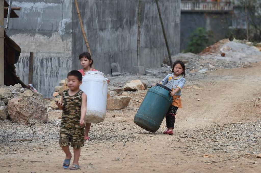 2015年2月27日,蓝秀雪(后左)搬运水桶,准备和爸爸到街上运水。