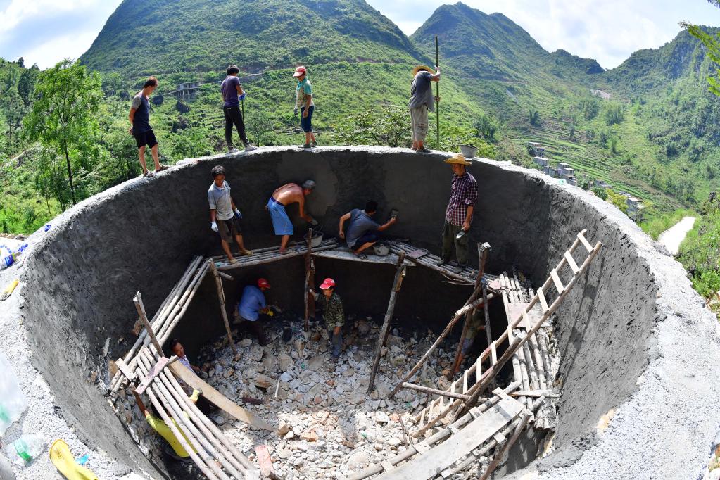 在弄勇村,村民在修建家庭水柜(2017年9月2日摄)。