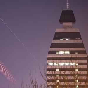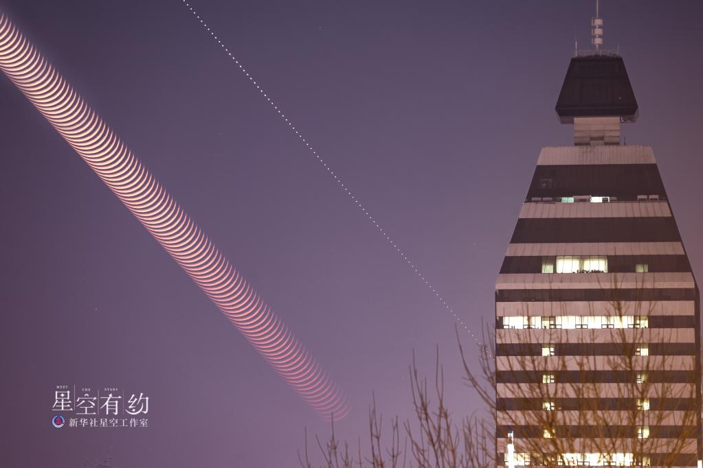 这是北京市天文摄影爱好者王俊峰2023年2月22日在北京市西城区拍摄的金星伴月牙(多张轨迹叠加)。(本人供图)