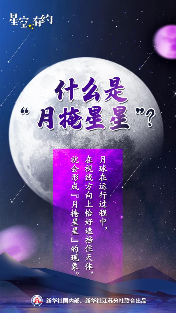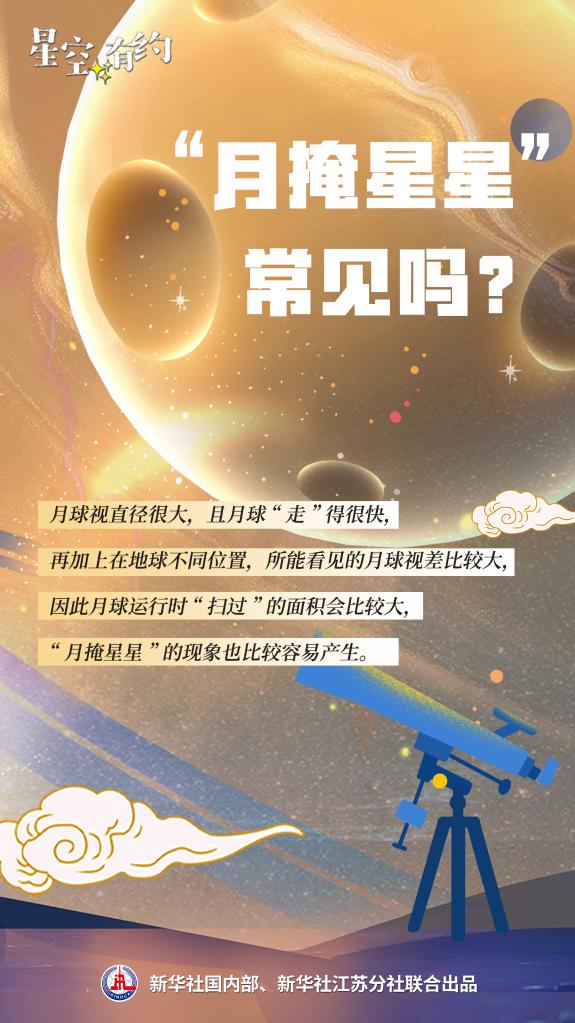 中科院紫金山天文台科普部主管王科超介绍,月球在运行过程中,在视线方向上恰好遮挡住天体,就会形成“月掩星星”的现象,原理与日食类似。“月球视直径很大,且月球‘走’得很快,再加上在地球不同位置,所能看见的月球视差比较大,因此月球运行时‘扫过’的面积会比较大,‘月掩星星’的现象也比较容易产生。”