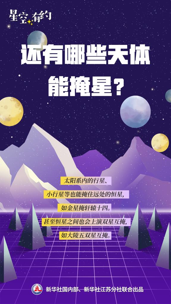 事实上,太阳系内的行星、小行星等也能掩住远处的恒星,如金星掩轩辕十四。甚至恒星之间也会上演双星互掩,如大陵五双星互掩。这一类天象在天文学上被统称为掩星。