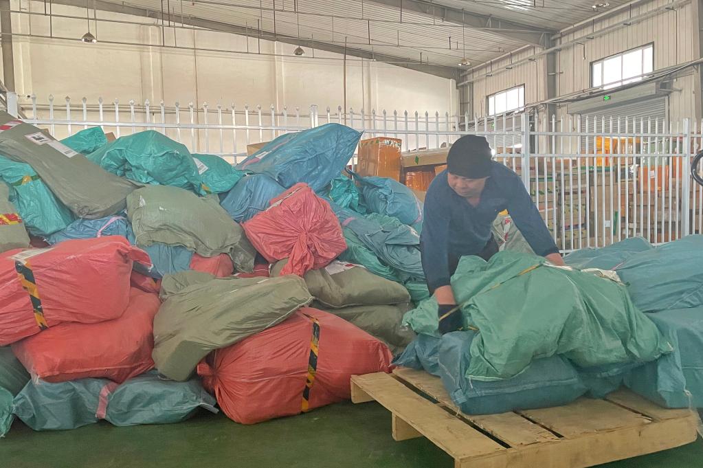 2023年3月21日,阿拉山口跨境电商分拣中心,工人正在分拣货品准备装车。新华社记者郝玉 摄