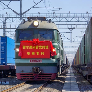 2022年4月1日,一列满载货物的跨境电商出口专列从霍尔果斯铁路口岸出境,驶往哈萨克斯坦。这是以霍尔果斯站为始发站开行的首列跨境电商专列。新华社发(邱静 摄)