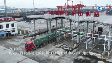 位于广西北部湾的钦州铁路集装箱中心站,一个个来自海外的集装箱经过智能化吊装作业,被有序装上火车。作为西部陆海新通道铁海联运的关键节点,钦州港东站每天到发的新通道铁海联运班列近20列。