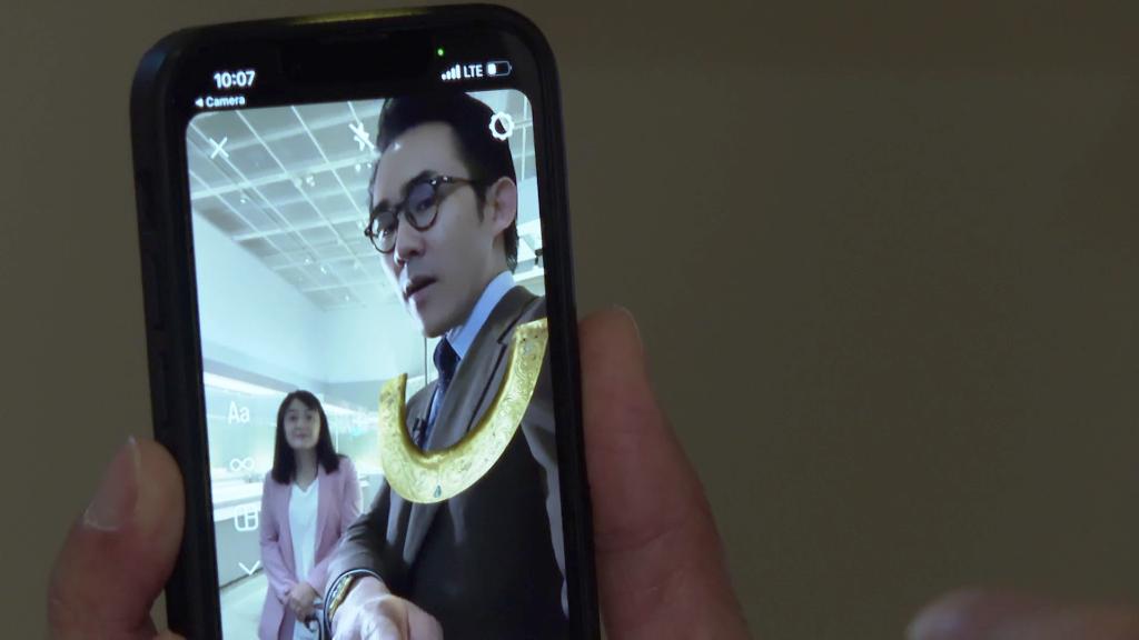 为了丰富观众的体验,展览特别介绍历代金器的制作工艺,并利用AI技术,让观众试戴“虚拟”黄金饰品,增强观众与文物之间的互动性。