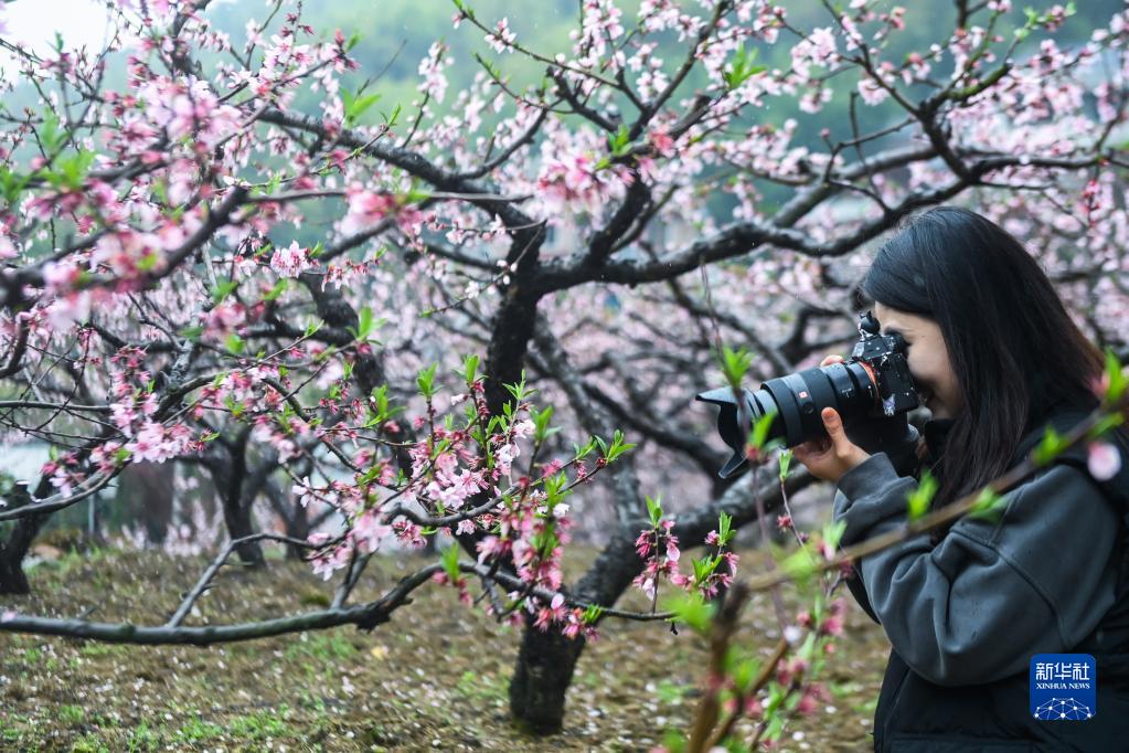 3月25日,游客在半山村的桃园内拍摄桃花。