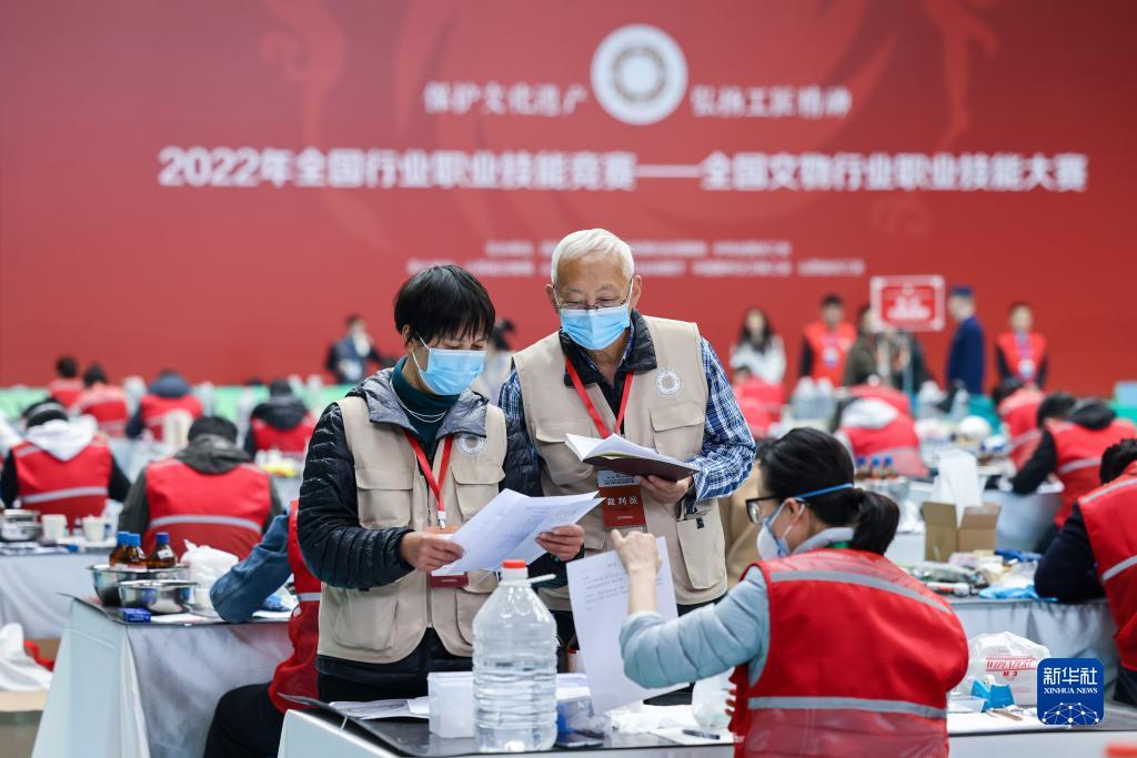 3月25日,裁判员在金属文物修复师比赛项目现场。