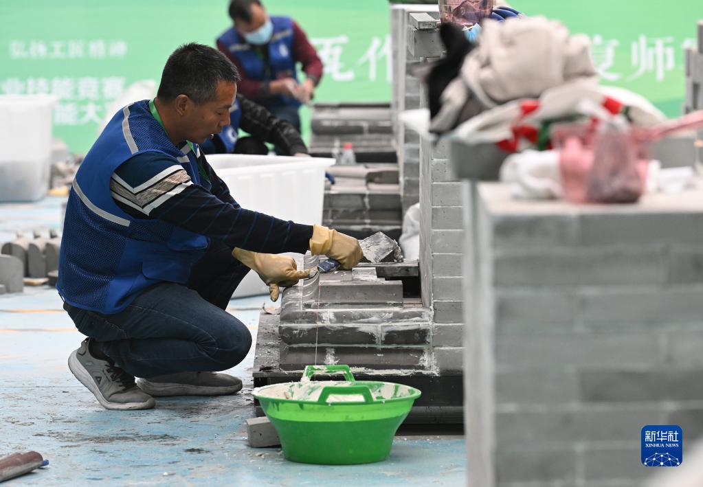 参加泥瓦作文物修复师比赛项目的选手在现场运用传统技术进行建筑制作和修复(3月25日摄)。