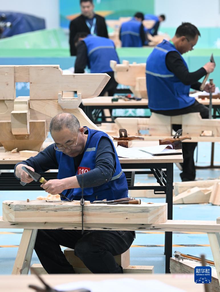 参加木作文物修复师比赛项目的选手在现场制作木质传统建筑构件(3月25日摄)。