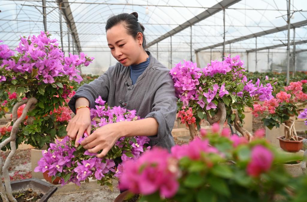 2月28日,在福建漳州大千园艺三角梅种植基地,员工在修剪三角梅盆栽。新华社记者林善传 摄