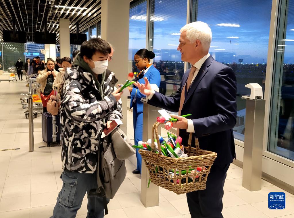 “欢迎来到阿姆斯特丹史基浦机场!”南航和史基浦机场代表在登机口拉起横幅,为当天乘坐阿姆斯特丹直飞北京大兴国际机场南航航班的旅客和机组人员发放荷兰特色纪念品——彩绘木质郁金香。