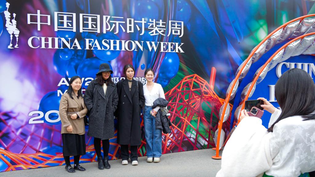 3月24日,观众在2023秋冬中国国际时装周展板前拍照留念。新华社记者魏弘毅 摄