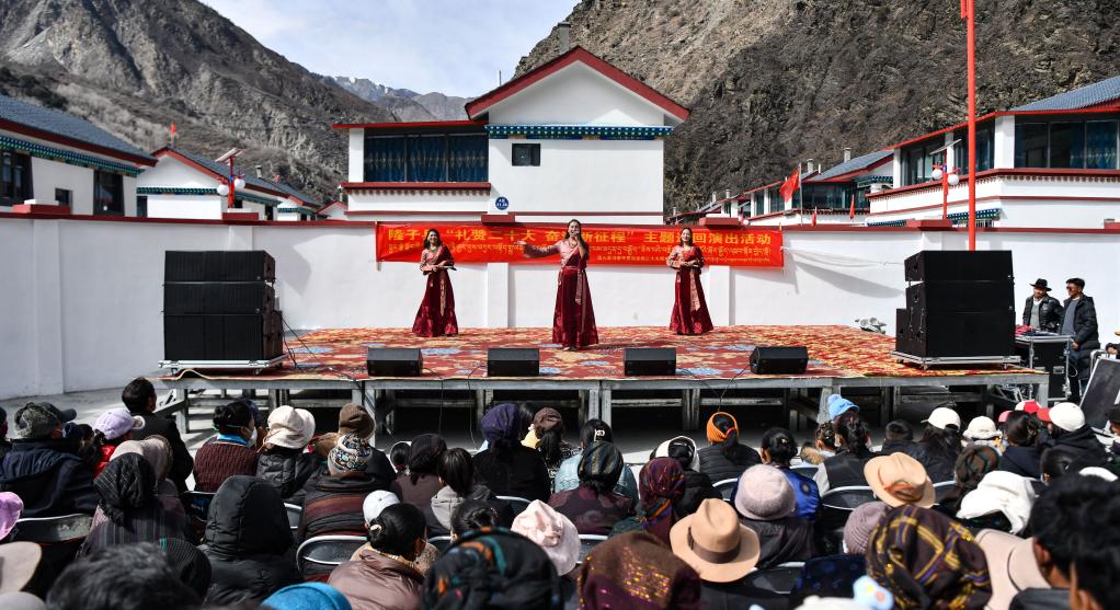 山南市隆子县艺术团来到隆子县斗玉珞巴民族乡绕让搬迁安置点开展藏历新年文艺演出(2月15日摄)。新华社记者晋美多吉 摄