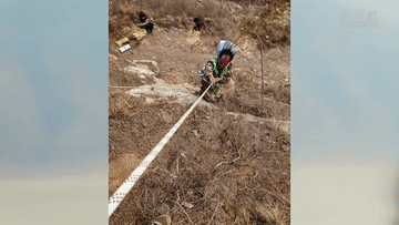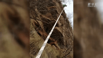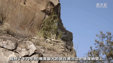 在陕北黄河边,有这么一群普通人,他们常年“像给高楼安装空调外机一样”,用绳子拴住腰,将人吊在悬崖间,“吊威亚”般在黄河西岸的悬崖峭壁上垒坑种树。