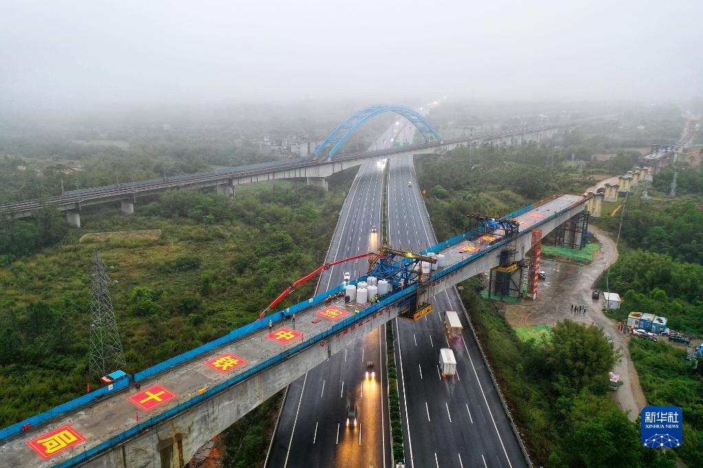 3月29日晚,随着最后一方混凝土注入,中铁十局承建的广(广州)湛(湛江)铁路长兴村特大桥跨G15沈海高速连续梁顺利合龙,这也是全线首座跨高速连续梁合龙。