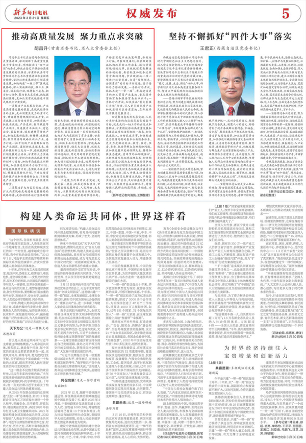 习近平总书记在全国两会期间发表重要讲话,深刻阐释了高质量发展这个首要任务,明确提出了“四个必须”的要求,释放出坚定不移推动高质量发展的时代强音。甘肃将认真学习贯彻习近平总书记重要讲话和全国两会精神,坚持以新发展理念引领高质量发展,加快构建“一核三带”区域发展格局,深入实施强科技、强工业、强省会、强县域行动,保持奋斗姿态,担当初心使命,聚力重点求突破,跳起摸高创佳绩,更加扎实有效地推进中国式现代化甘肃实践。