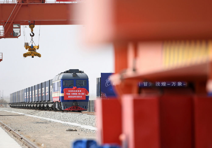 图为甘肃首趟中老铁路国际货运列车在敦煌市铁路西货站综合货场等待发车(2022年4月21日摄)。新华社记者 陈斌 摄