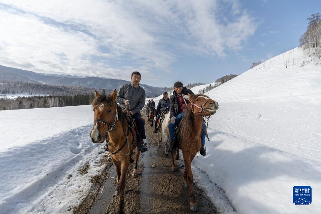 3月30日,苏卡(前左)和马队成员骑马上山。