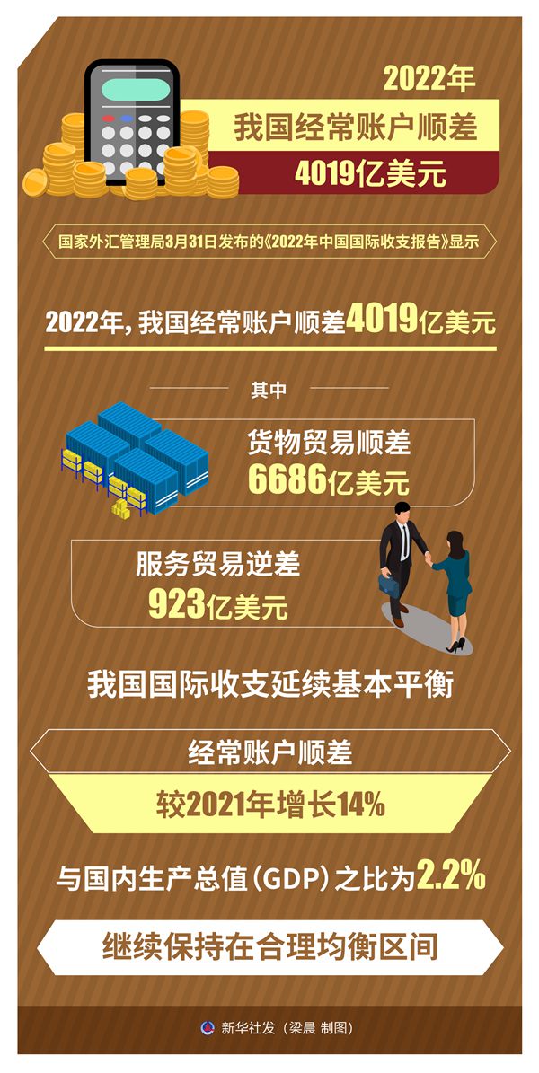 新华社北京3月31日电(记者刘开雄)国家外汇管理局31日发布数据显示,2022年,我国经常账户顺差4019亿美元,其中,货物贸易顺差6686亿美元,服务贸易逆差923亿美元。