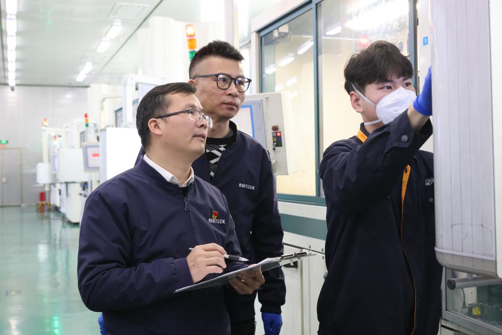 邱联昌(左一)在车间查看生产相关参数情况。潘萍摄