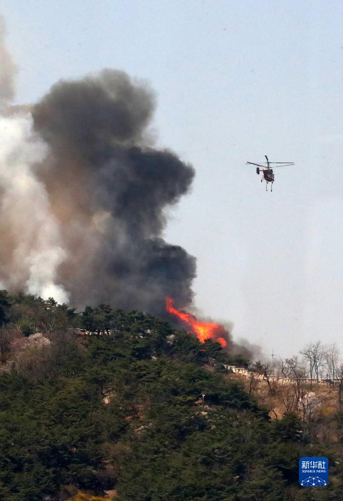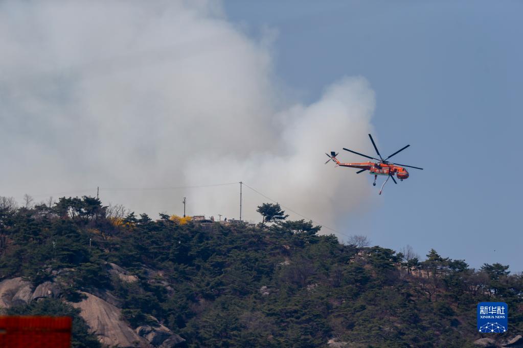 4月2日,直升机在韩国首尔市仁王山上空执行灭火作业。新华社/纽西斯通讯社