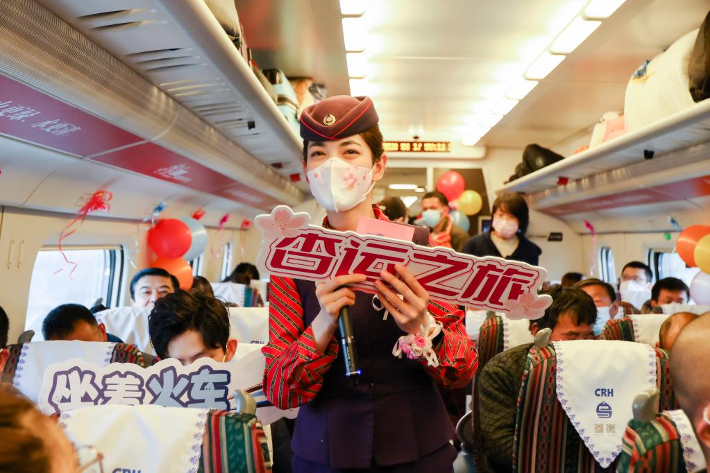 3月17日,列车员在首趟“杏花号”高铁列车车厢内与乘客进行互动游戏。新华社记者 郝昭 摄