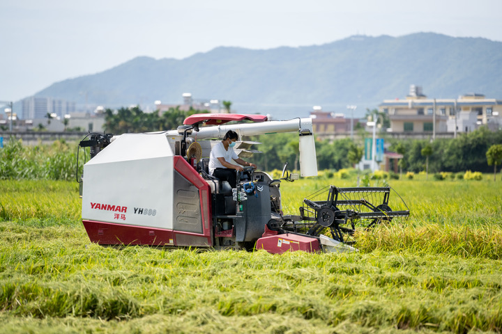 2022年7月,农机手在三亚市崖州区(坝头)南繁公共试验基地收割水稻。新华社记者胡智轩 摄