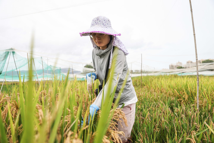 2022年4月,工作人员在南繁科研育种基地收集水稻种子。新华社记者张丽芸 摄