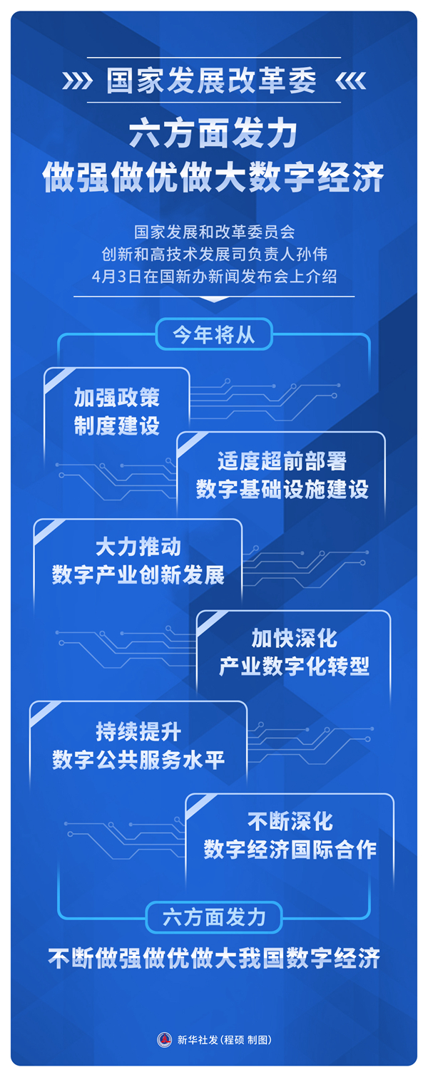 新华社北京4月3日电(记者王思北)国家发展和改革委员会创新和高技术发展司负责人孙伟3日在国新办新闻发布会上介绍,今年将从加强政策制度建设、适度超前部署数字基础设施建设、大力推动数字产业创新发展、加快深化产业数字化转型、持续提升数字公共服务水平、不断深化数字经济国际合作六方面发力,不断做强做优做大我国数字经济。