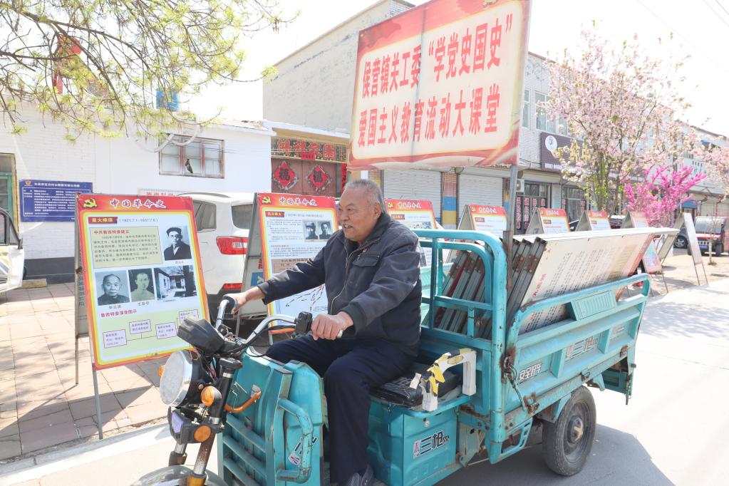 2015年6月,退休后的王忠祥回到家乡,自费做了上百块党史国史展板,创办“爱国主义教育流动大课堂”。他骑着三轮车,拉着展板,走到哪讲到哪。“我要把历史讲给孩子们听。”他说。