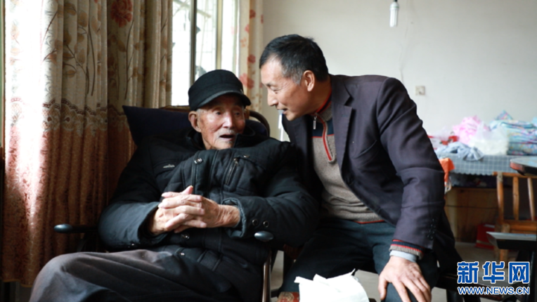 胡阿新(左一)向胡学健讲述无名女战士之事。新华网 刘媛 摄