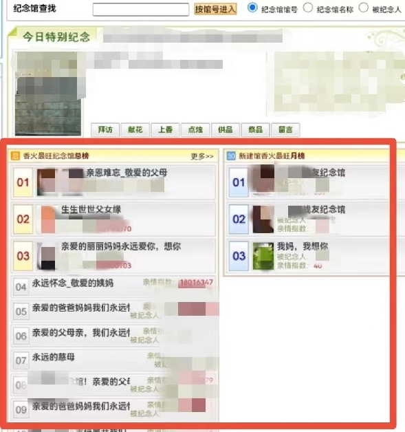 但记者也发现“活人网墓”“网络孝子香火排行榜”“个人信息泄露”等问题仍未绝迹。