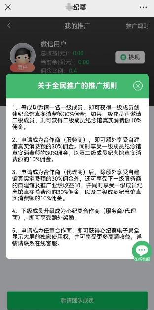 记者还发现,“心纪奠”平台通过消费抽成鼓励发展“下线”牟利。平台设计了复杂的“供品和套餐”,明确规定“每成功邀请一名一级成员,即可获得一级成员创建纪念馆真实消费额30%佣金;如果一级成员再邀请二级成员,则可获得二级成员纪念馆真实消费额10%佣金。”此外,成为“合作商”还可以享受额外的消费佣金。
