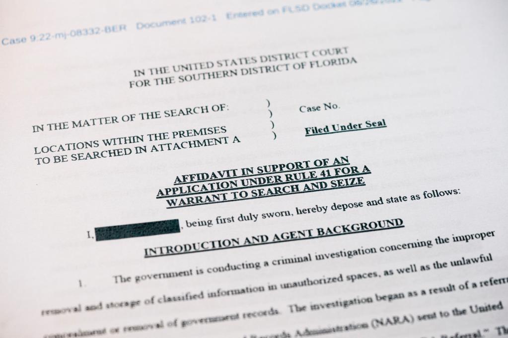 这是2022年8月26日拍摄的美国联邦调查局申请搜查前总统特朗普住所海湖庄园时向法院提交书面证词的部分内容。新华社记者刘杰摄